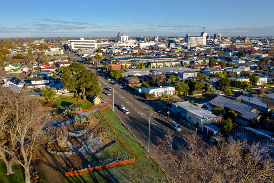 An aerial view of the Milverton Park playground looking towards the city centre. The new playground was reopened on Saturday, 4 August, 2019. The park was gifted to the Council in 1925 by William Milverton, whose only condition was that the land remains free for the public to use for recreation and amusement.