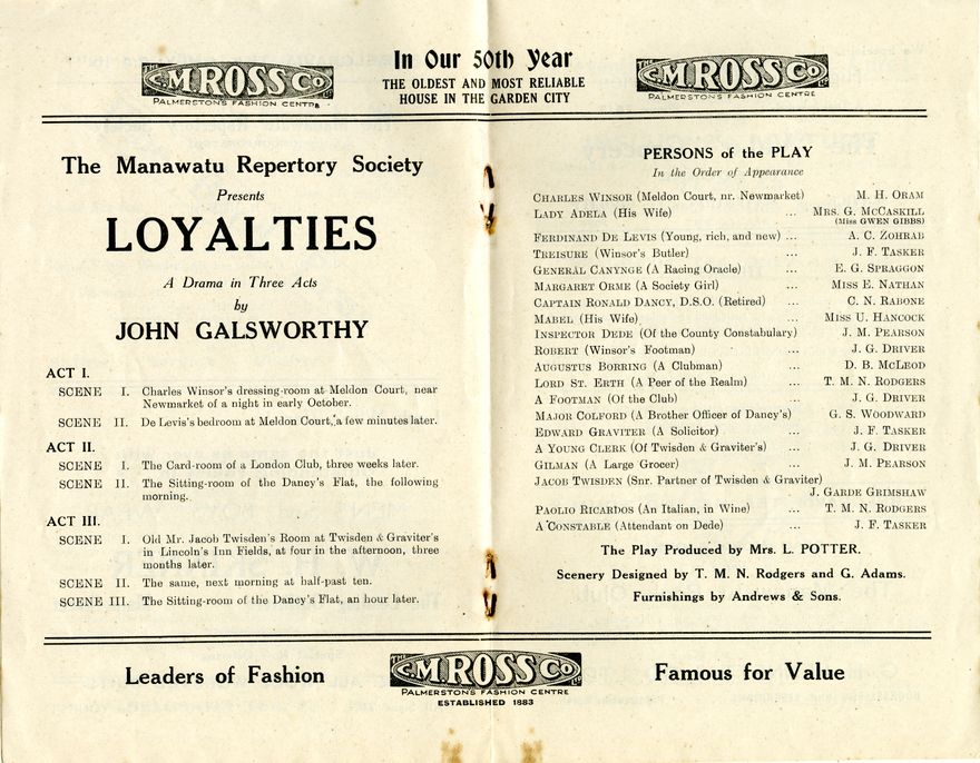 C M Ross Co Ltd celebrated 50 years of trading in 1932.. C M Ross Co. Ltd was one of the foremost department stores of Palmerston North and operated in The Square from 1883 until it was sold to Milne and Choyce in 1959. The advertisement was on the centrefold of the Manawatu Repertory Society's programme for their production of 'Loyalties' by John Galsworthy. The centrefold also features the cast of the production.