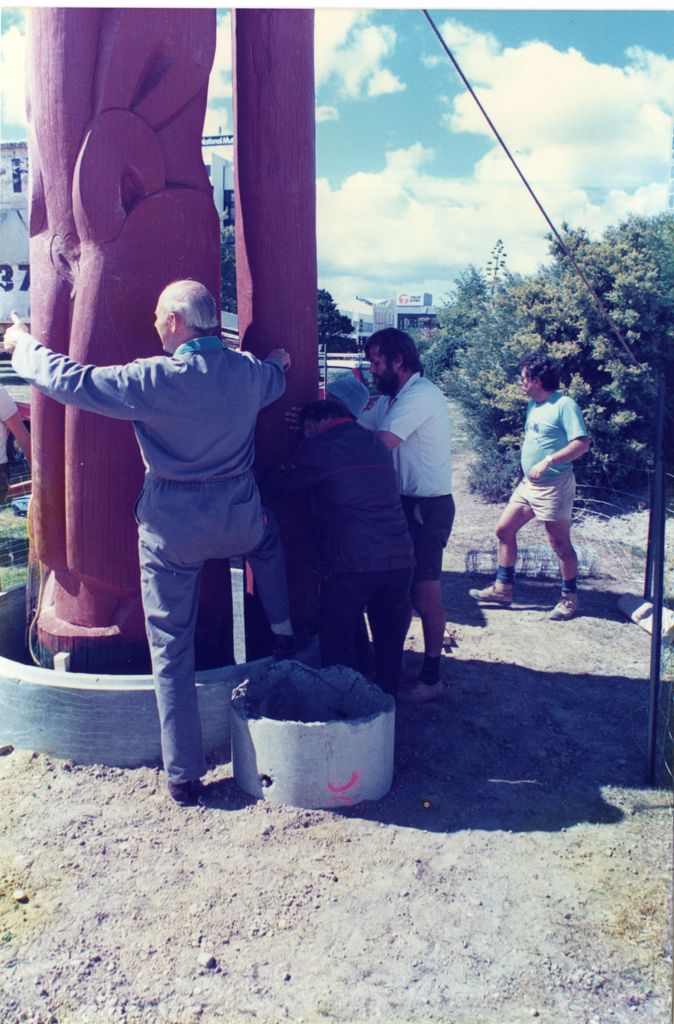 Council staff assisted by John Bevan Ford, install pouwhenua before the re-dedication of The Square as ‘Te Marae o Hine’ – The Courtyard of the Daughter of Peace. The re-dedication occurred on Saturday, 3 March, 1990