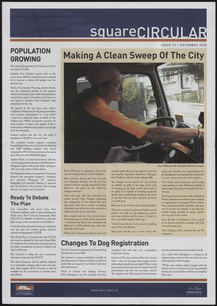 The Square Circular was Palmerston North City Council's monthly community publication, informing Palmerstonians of PNCC initiatives, activites, and events. This month's issue includes: population growth; street cleaning; Rose O'Flaherty; Long Term Community Council Plan; dog registration; City Heart, the square; Youth Council; Town Crier, computers sale; roading; rezoning; Te Manawa; Rachel Johnson; Green screen award; New Year's Eve in the Square.