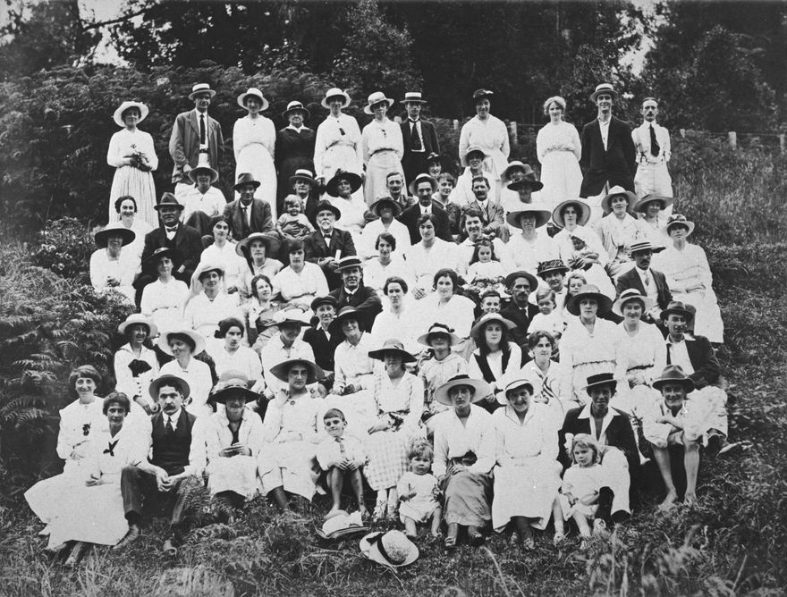 A group of staff and some children, including C M Ross who is seated in suit and hat, with white beard, about 4 rows back, amongst female staff members.