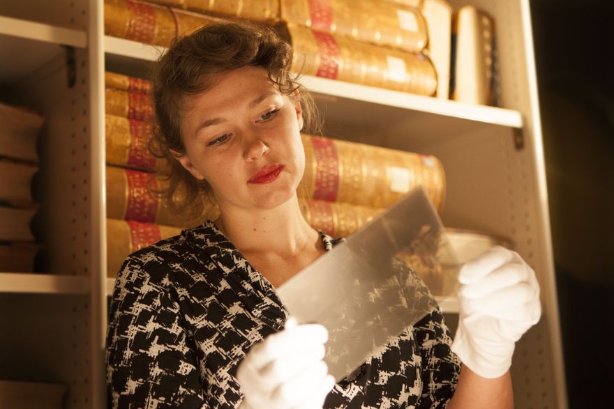 This photo shows Heather Glasgow looking at a glass plate negative in the Ian Matheson City Archives.