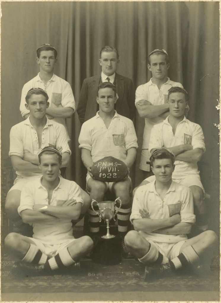 The players on this team are unidentified. Palmerston North High School was the first secondary school in Palmerston North, built in Featherston Street 1902. It was destroyed by fire in April 1910 and replaced in 1911. The school separated into boys and girls high schools in 1919, with a purpose built facility for girls opening September 1920.
