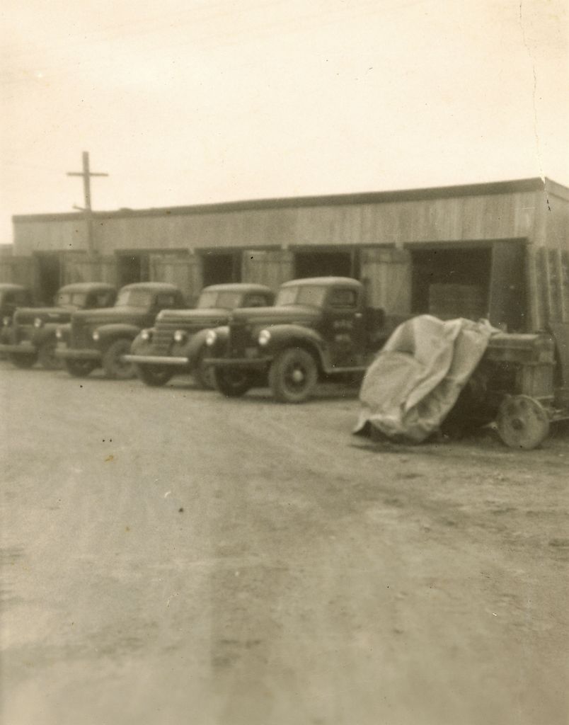 Trucks lined up outside their garages at the City Council Depot, situated on the corner of Albert and Ferguson Streets, Palmerston North.
