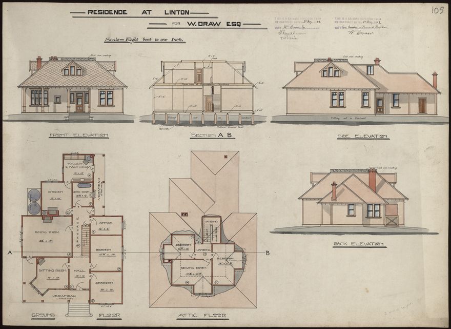 This plan for a house with three rooms in its attic was designed by L. G. West for W. Craw. The Danish-born architect Ludolph Georg West (1846-1919) established an architectural practice in Palmerston North in about 1880. In 1912 he formed a partnership with is son, Ernest Vilhem West, who continued the business after his father's death.