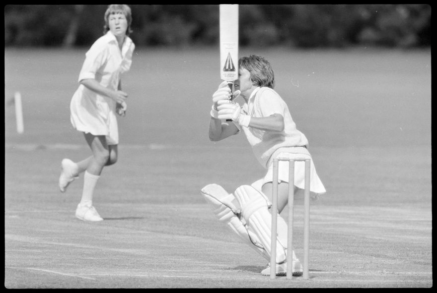 This image was taken (but not used) by the Evening Standard on 19th of January 1982. It depicts Manawatū Women’s cricket team taking on the International Australian Women’s team in a limited over warm-up match for the Hansell's Vita Fresh Women's World Cup 1981/1982. The match was held at Ongley Park in Palmerston North. The Australian team won by 202 runs. The match report ‘Aussies too polished in all facets’ was written by Ford Watson and published the next day: