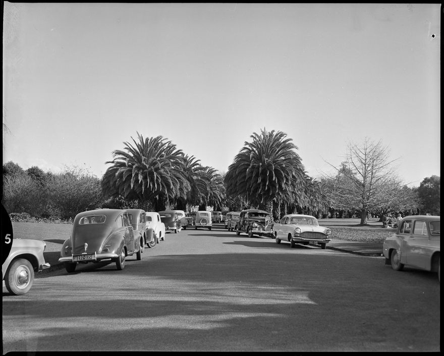This image was taken for a story that ran in The Manawatu Evening Standard on 29 August 1960 "Probably the busiest place in Palmerston North yesterday was the Esplanade. During the afternoon, traffic reached almost congestion point and obtaining a parking place was as difficult a feat as securing one in Broadway on Friday night. The roads around the children's playing area and the bird cages (as illustrated) were lined with cars."