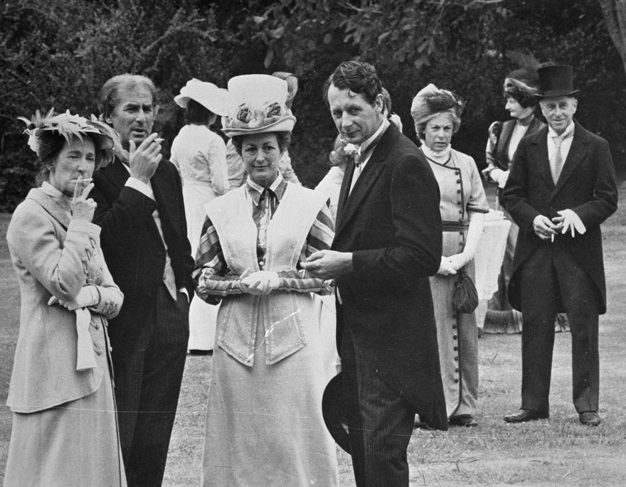 This photograph shows the filming of scene 16, on Saturday March 19 1977, of “Man Against the World” - a film about Joseph Pawelka. This was filmed in the grounds of Caccia Birch in Te Awe Awe Street,Palmerston North. In this photograph the extras pass the time until they are needed. John Dawick is fourth from the left, front row.