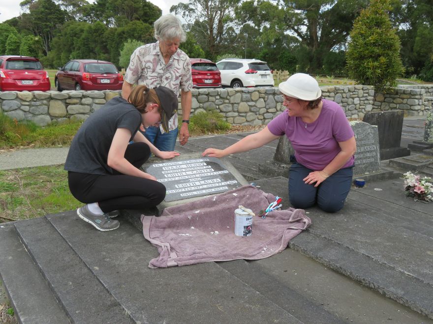 Cleaning headstone at Ashhurst Cemetery