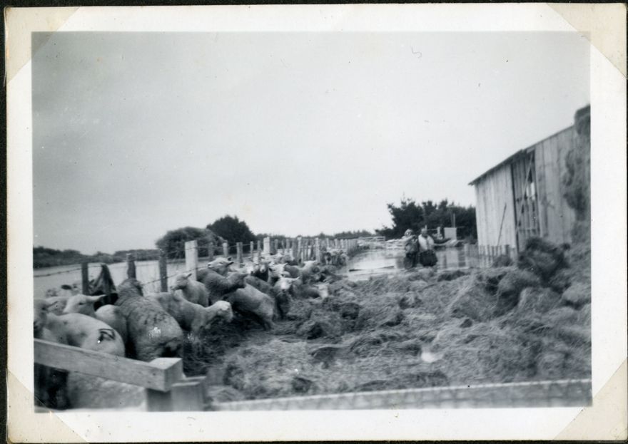 The 1953 flood of the Manawatu and Oroua Rivers was one of the worst on record, for the area. This photograph shows some sheep belonging to Norm Terry who are close to being caught in the Rangiotu Flood.