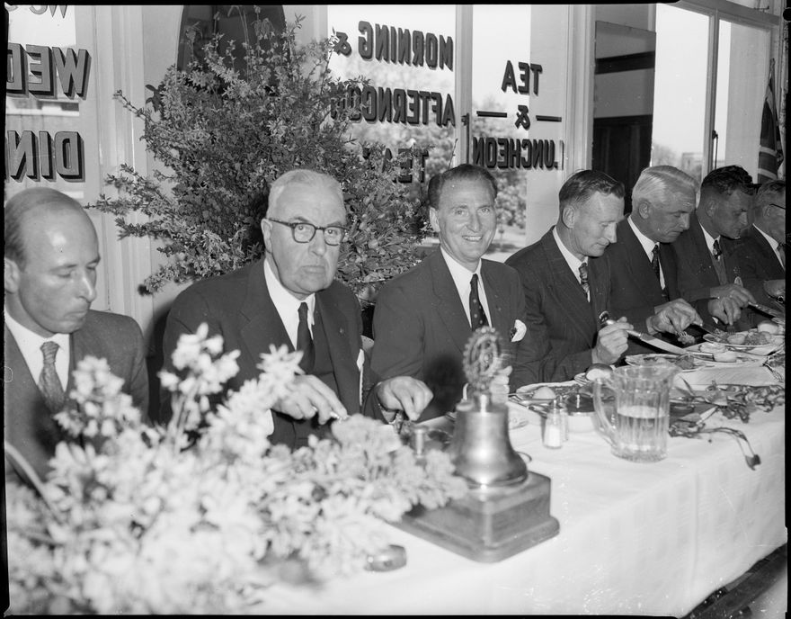 This image was taken for a story that ran in The Manawatu Evening Standard on 04 October 1958: "The president of Rotary International (Mr. G. Clifford Randall) was entertained at luncheon today by members of the Palmerston North Rotary Club and visitors. From left to right: Mr. W.B. Tennent, M.P., Mayor and Past District Governor of Rotary; Mr. Randall; and Mr. W.T. Jaggard, president of the Palmerston North Club."