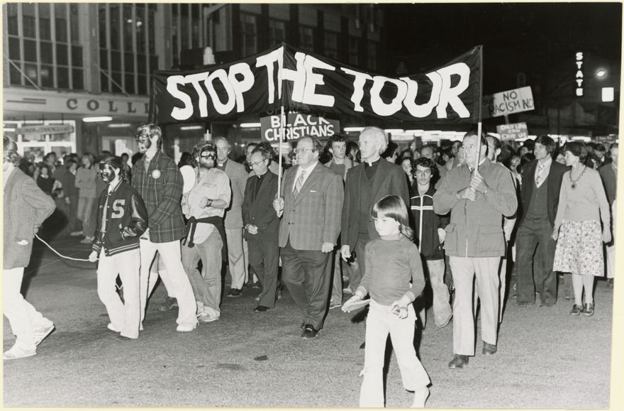 Approximately 5,000 people showed their opposition to the pending Springbok rugby tour by marching down Broadway then into The Square. They assembled at the Lions Den where they were addressed by a variety of speakers. The march was headed by Labour MP for Palmerston North Mr. Joe Walding (centre). Others under the banner include Rev. Dr David Penman of All Saints Church, march organiser Bishop Peter Cullinane, Rev. Dr Alan Webster and the President of the Manawatu Trades Council Mr. Noren Byrnes. The same evening a group of 8,000 pro-tour supporters also gathered in The Square.