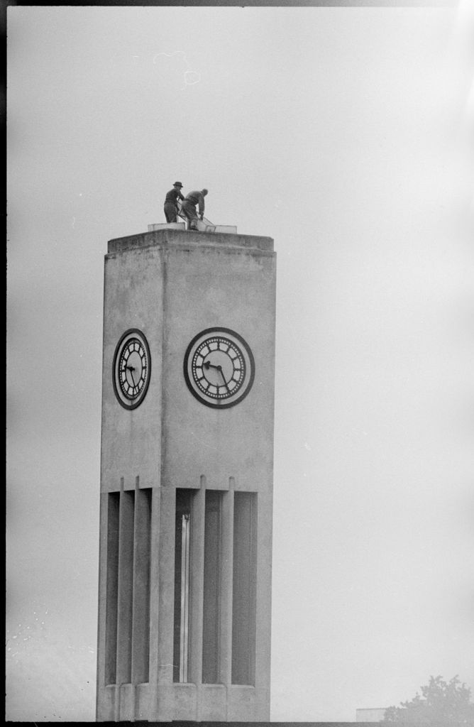 This image was taken for a story that ran in The Manawatu Evening Standard on 7th December 1965 "In heavy rain these two men begin the task of erecting the Christmas Cross on top of the clock tower."