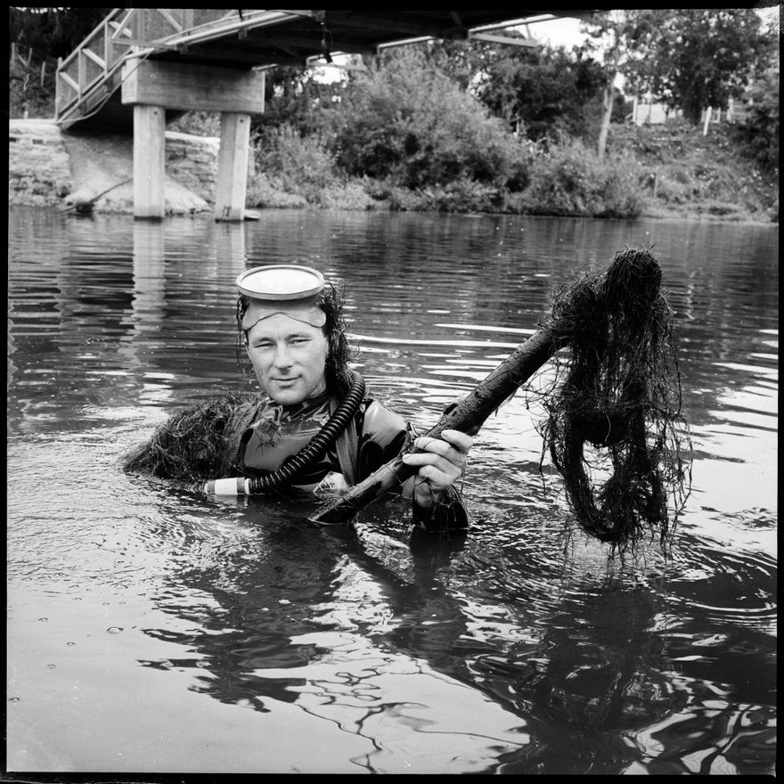 This image was taken for a story that ran in The Manawatu Evening Standard on 16 January, 1964. "A frogman, Mr Clive Lohta, certainly made some strange finds when grubbing on the bed of the Centennial Lake yesterday morning. He was clearing underwater obstructions for the opening of the Carnival of the Lake tomorrow. Before finding this water-soaked branch and bottom weed, he brought out several concrete blocks."