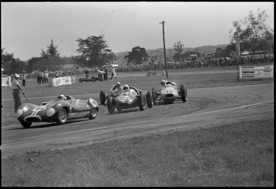 This image was not published in The Manawatu Evening Standard, taken on 6th March, 1963. [Four cars racing.]