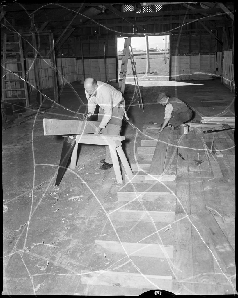 This image was taken for a story that ran in The Manawatu Evening Standard on 20 April 1961 "Cutting and shaping timber for a home appliance stall at the Industries Fair are Mr. V. Harriman and Mr. T. Jones (kneeling). The latter commented to the photographer that he had been reading the "Manawatu Standard" for 50 years."