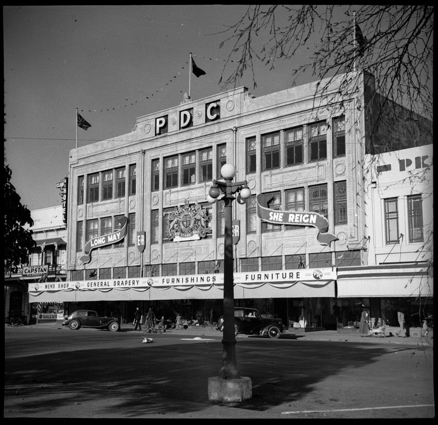 The flags, bunting and decorations on the façade of the PDC department store were probably hung to celebrate and Coronation of Queen Elizabeth II in June 1953, or for the Royal Visit of the Queen and Duke of Edinburgh in January 1954.