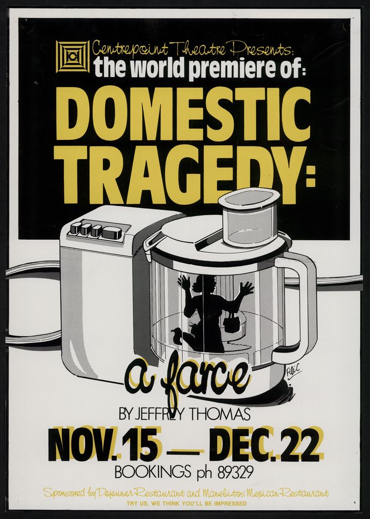 "Centrepoint Theatre presents the world premiere of: Domestic Tragedy: a farce by Jeffrey Thomas. Nov. 15 - Dec. 22. Bookings ph 89329. Spnsored by Dejeuner Restaurant and Mamelitos Mexican Restaruant. Try us, we think you'll be impressed." Part of a collection of posters that were displayed in the Public Library in the 1970s - 1980s.