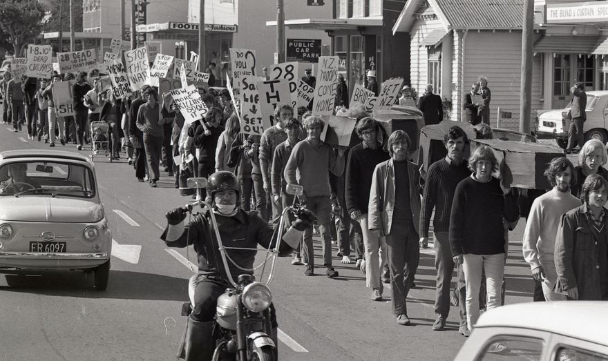 "More than 200 anti-Vietnam war demonstrators marched quietly and solemnly along Broadway Avenue in Palmerston North shortly after noon yesterday, carrying a dozen black-draped coffins designed to symbolise the 28 New Zealanders killed in the Vietnam War.