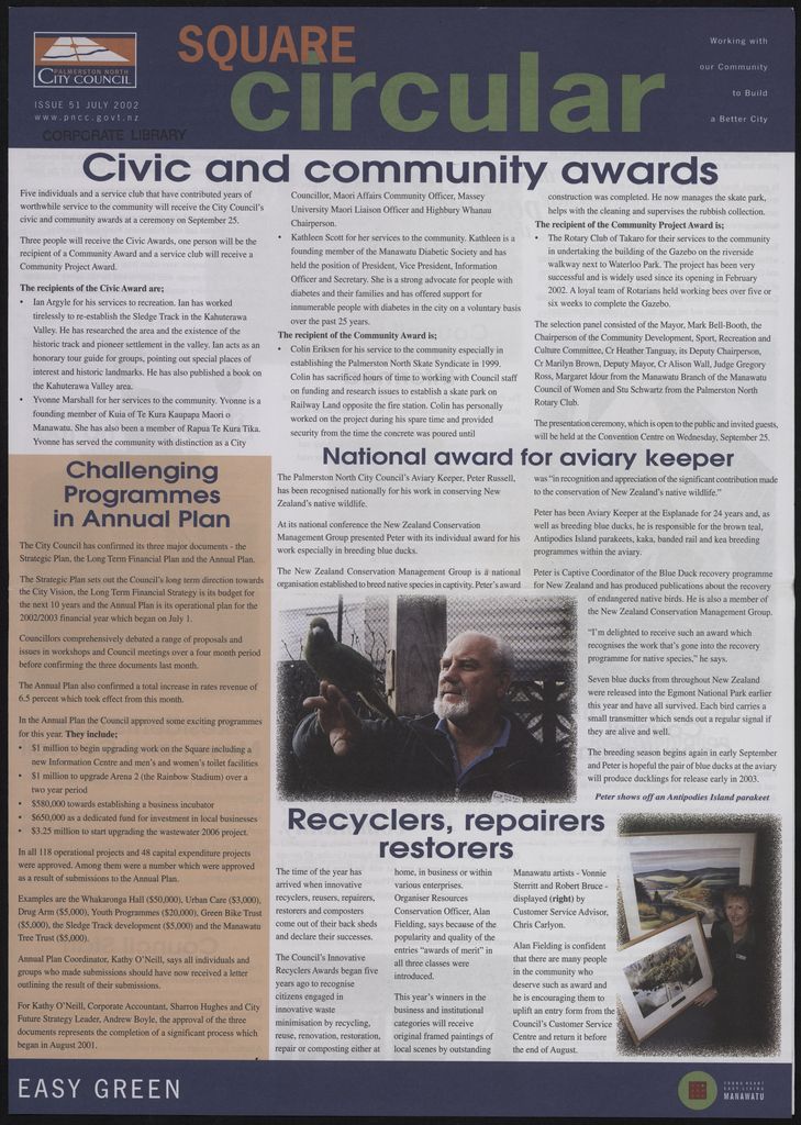 The Square Circular was Palmerston North City Council's monthly community publication, informing Palmerstonians of PNCC initiatives, activites, and events. This month's issue includes: civic awards; strategic plan; long term financial plan; annual plan; draft civil defence and emergency management plan; aviary; Peter Russell; recycling; survey; Regent theatre; international representatives scheme; electoral system; elections; rubbish bags; midwinter festival.