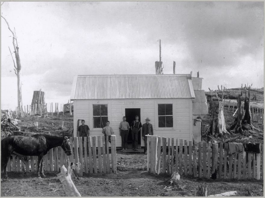 Shown here is "Rimunui", the Philpott family whare at Komako, Pohangina Valley c 1900-1910. In 1975, this whare was on the Rutherford farm.