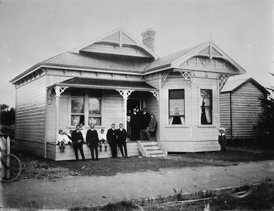 A group of men and children on the verandah of a villa, situated on an undeveloped section.