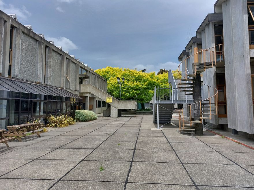 Pictured is the former student centre and cafe (left) and library (right) at the Hokowhitu Campus. These buildings are unique examples of modernist brutalism in the city.