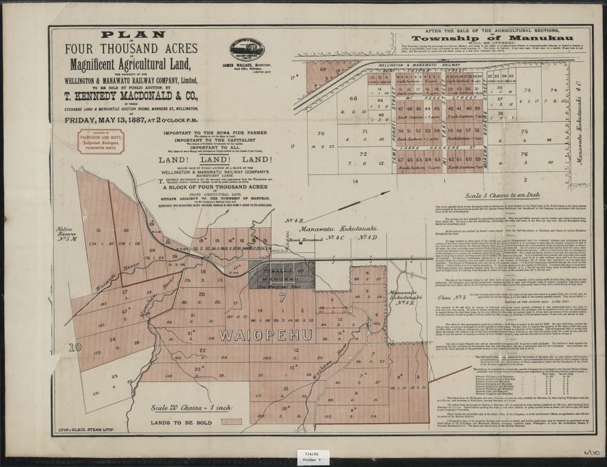 Land sale map showing the sections available in the township of Manukau and the surrounding area. The land had been allocated to the Wellington & Manawatu Railway Company.