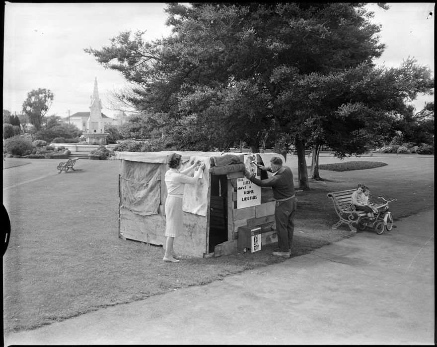 This image was taken for a story that ran in The Manawatu Evening Standard on 03 October 1960 "This "house" has been erected in the Square by a band of enthusiastic helpers to give the public some idea of the type of accommodation in Korea today. It will form part of the Save the Children Organization's appeal for funds to help the Koreans."