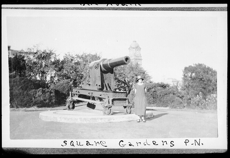 Woman standing beside a cannon, one of two bought to Palmerston North in 1909, being surplus equipment of the Defence Department. Both cannons were removed and scrapped during the 1940s.