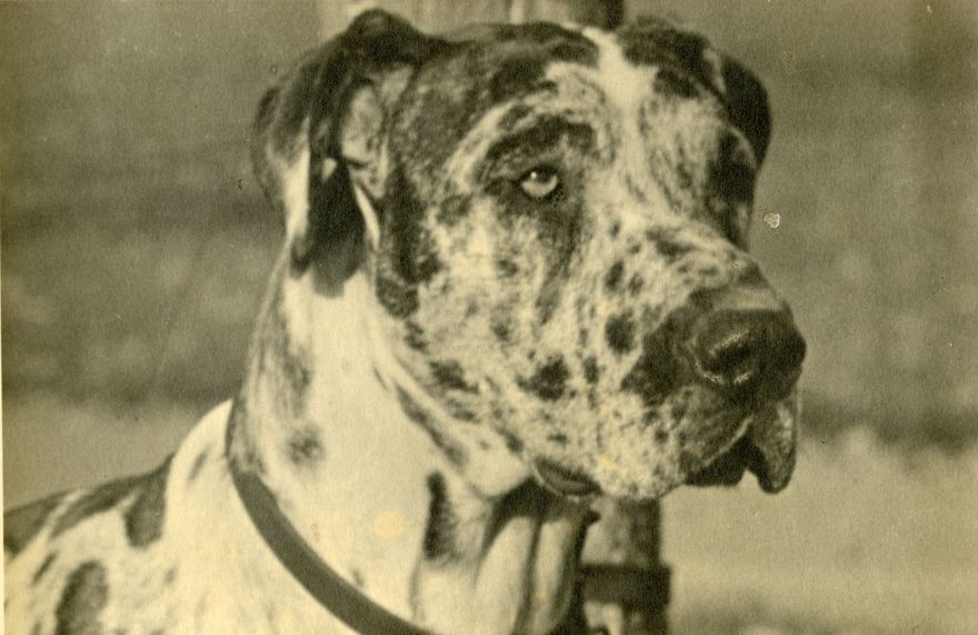Tiger was a Great Dane belonging to Captain Harding Waipuke Leaf (Ngā Puhi), of the Māori Battalion. Harding and Tiger trained at the Palmerston North Showgrounds between January and May of 1940. The images were taken by Keith Collinson, of the family who owned the Collinson & Cunninghame's department store. He was a Sergeant based in the Records Department at the Showgrounds. On the back of the photographs Keith wrote, “Mascot of the Māori Battalion.”
