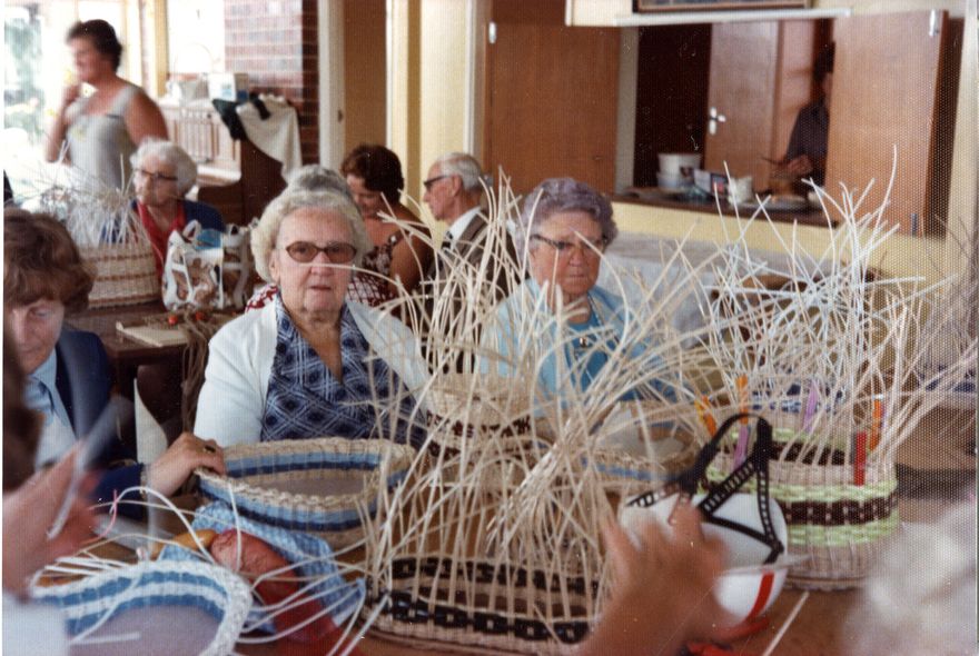 Members of the Care and Craft group take part in basket making at the Awapuni Community Centre. Hazel Cooksley founded the group in the 1970s, and based it on the format developed by Elsie (surname unknown) and run at the Rangiora Community Centre. The group provided social interaction and activities including; crafts; card games; sing-alongs and celebrations. The group was very popular, with van loads of residents from rest homes joining the sessions.