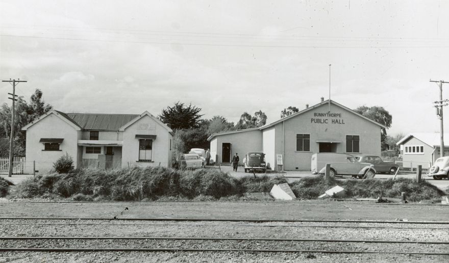 Looking across the railway lines to the Main Road through Bunnythorpe.
