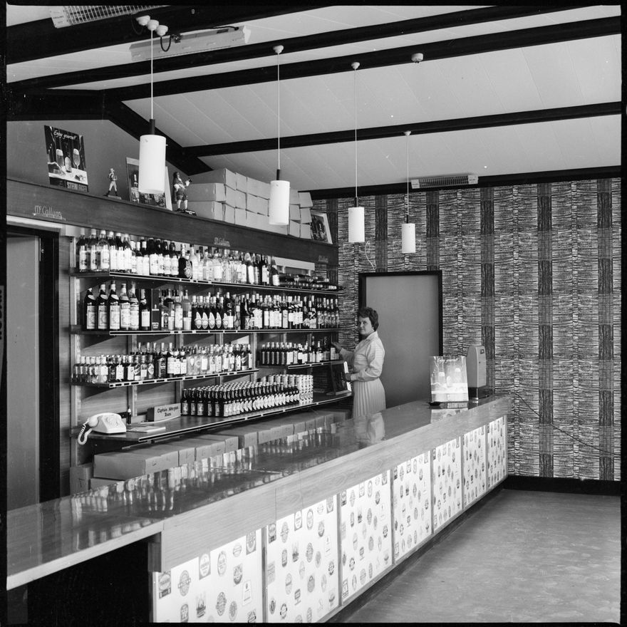This image was taken for a story that ran in The Manawatu Evening Standard on 3rd December 1965 "Carrying a wide range of ales, wines and spirits, the bottle store at the new Awapuni Hotel is so designed to give rapid service both to hotel clients and travellers. Adequate car parking is available immediately outside the store."