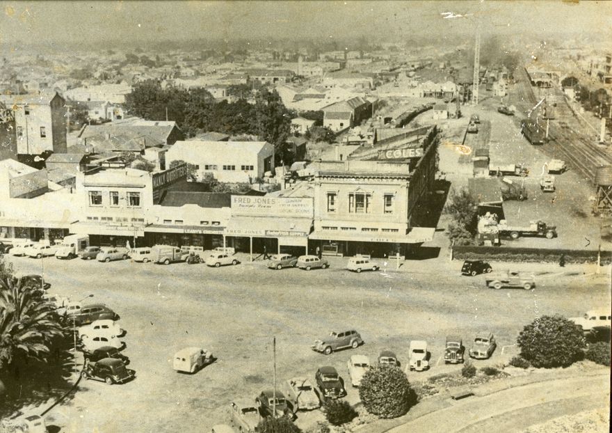 Shown here is the corner of The Square and Main Street, looking down to the Railway Station and yards. Businesses include Coles, Fred Jones and Leary’s Chemist.