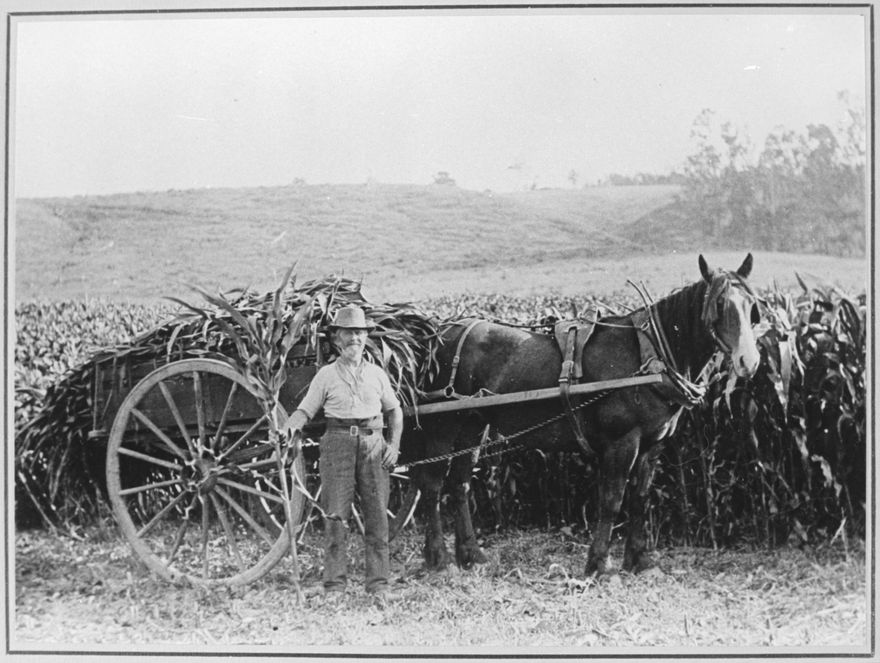 William Chowen stands beside a horse (Blossom) and cart beside a maize field. Refer Fitzherbert East Aokautere School and District 1889-1989, p 23