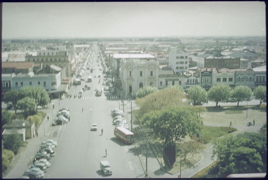 This image is from a series taken around 1957 that shows a view of The Square from the top of the Hopwood Clock Tower. This one looks up Rangitikei Street.