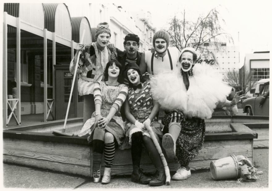 Students from Auckland Theatre here to give a series of three performances at the Manawatū Art Gallery to support Centrepoint Theatre. They are pictured in Coleman Mall alongside the ANZ Bank. The Odeon Picture Theatre is in the background.