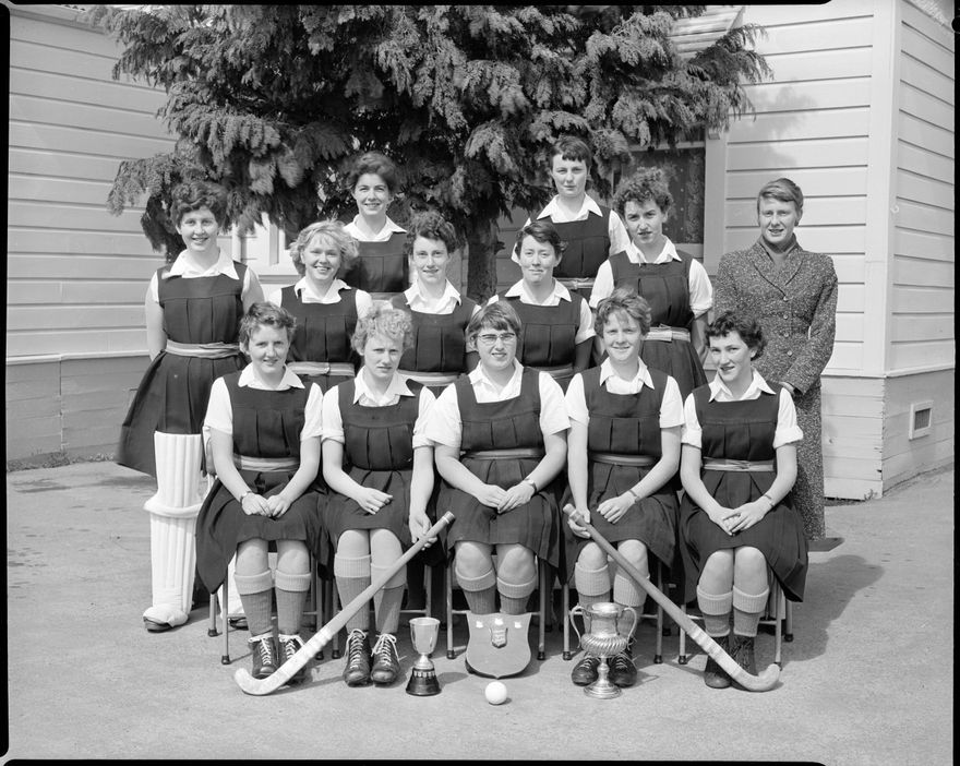 A group of twelve female students at the Palmerston North Teachers' College pose with their coach, hockey sticks and three trophies. This negative comes from the Elmar Collection - a large series of semi-identified and unidentified images from the 1930s-1970s.