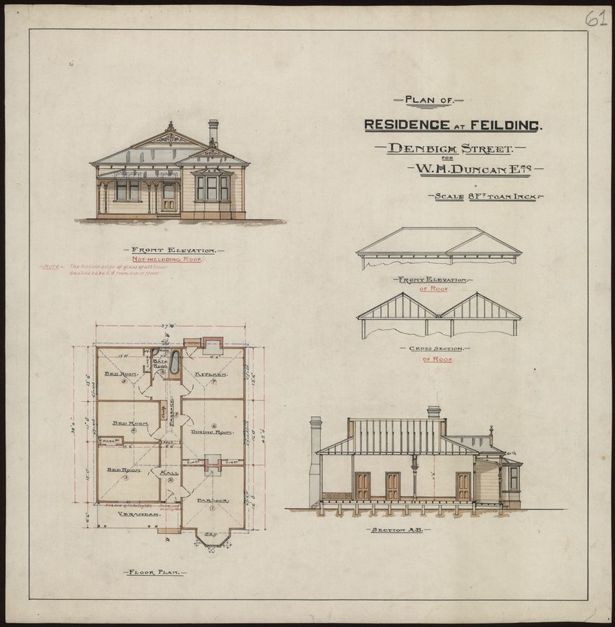This plan depicts a single-storey, three bedroom villa, that was designed by L. G. West for W. H. Duncan of Feilding. The Danish-born architect Ludolph Georg West (1846-1919) established an architectural practice in Palmerston North in about 1880. In 1912 he formed a partnership with is son, Ernest Vilhem West, who continued the business after his father's death.