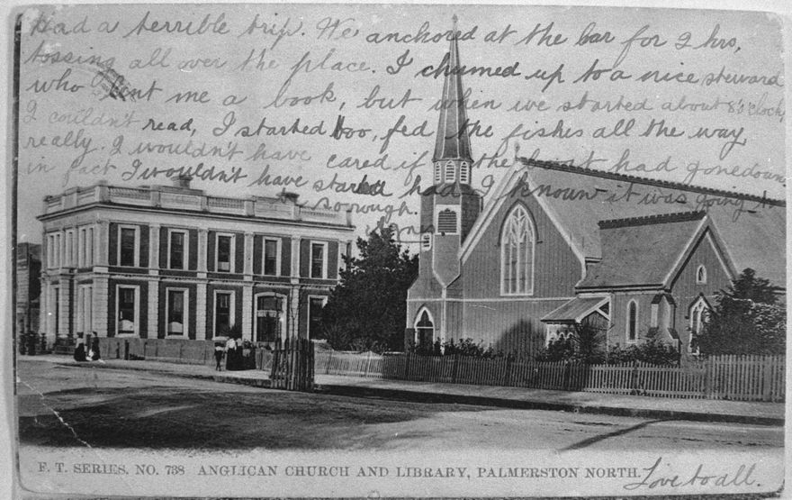 The building on the left was constructed as the Colonial Bank in c1892. It was used as a Public Library 1900-1905 before being converted into the administration building of the Palmerston North Borough Council. All Saints was the second on the site, and served as the Anglican church in Palmerston North 1881-1914, when it was replaced with the present building. The postcard was sent by a visitor to Palmerston North, to Miss Davidson in Auckland in 1906.