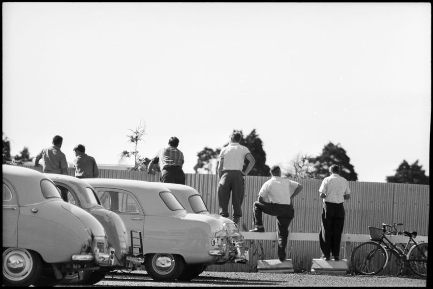 [Image of spectators standing on a small rail, looking over the park fences at the cricket, probably the Hawke Cup challenge match.]