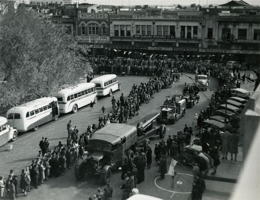 Peace with Germany was announced 8 May 1945 and official celebrations took place in Palmerston North the following day. Church services were held at 10am, followed by general celebrations. The procession marched round The Square to the Band Rotunda