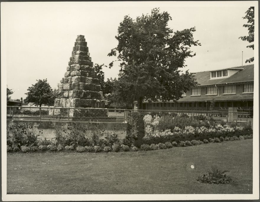 This is the memorial dedicated to the memory of officers and men of the New Zealand Medical Corps (1914-1918) who were trained the Awapuni Racecourse. It was erected in 1929. The memorial is a stone cairn fountain, inside a pool constructed in the shape of a cross.