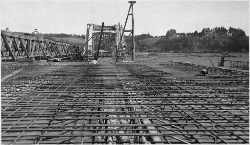 This was the second bridge over the Manawatu River in Palmerston North, replacing the original structure built in 1877. It was constructed by Fletcher Construction and remained until 1986 when it proved too small for the volume of traffic, particularly as it serves the main route to Massey University. the photograph, looking eastward, shows the steel reinforcing for the concrete decking. to the left can be seen the wooden sides of the first Fitzherbert Bridge.