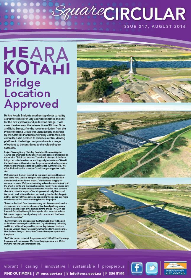 The Square Circular was Palmerston North City Council's monthly community publication, informing Palmerstonians of PNCC initiatives, activites, and events. This month's issue includes: He Ara Kotahi Bridge; Civil Defence; arts funding; recycling; parking; library; elections; public consultation; councillor contact details; council meetings.