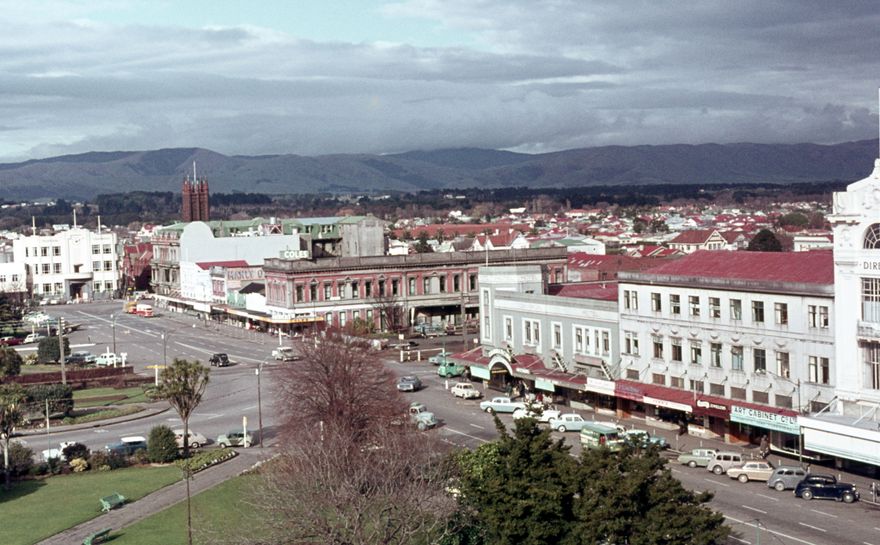 Beyond this block of businesses, West End suburban housing can be seen. The Tararua ranges are in the distance.