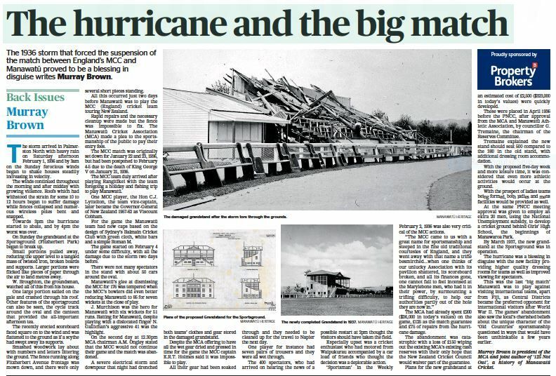 Local historians weekly "Back Issues" article in the Manawatū Standard. The 1936 storm that destroyed the Sportsground (Fitzherbert Park) grandstand and forced the abandonment of an international cricket match.