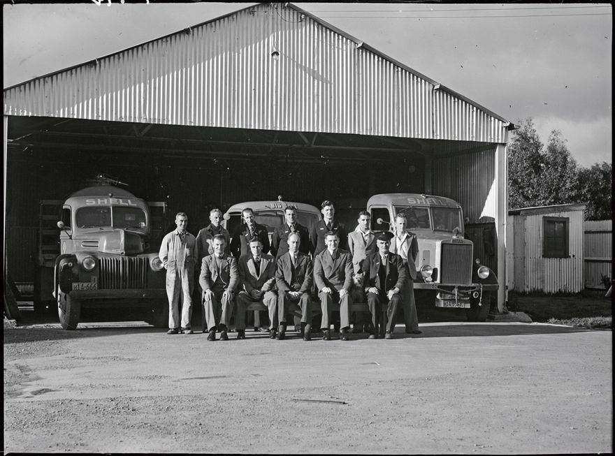 - Unidentified staff members of the Shell Petroleum company pose in front of the Shell trucks. This is possibly the Keith Street Depot, situated at 69 Keith Street.