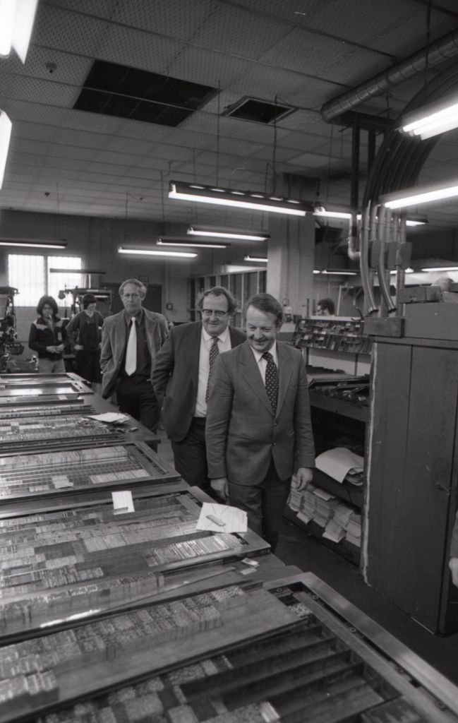 This image was taken (but not used) for the Manawatū Evening Standard on 17th November 1978. Labour leader Bill Rowling toured the back offices of the Manawatū Evening Standard, speaking with staff and viewing publishing equipment prior to the 1978 General Election held on 25th November. Also present is former Labour Member of Parliament Joseph Albert Walding, who regained the Palmerston North electorate with an election night majority of 2601 in the election.